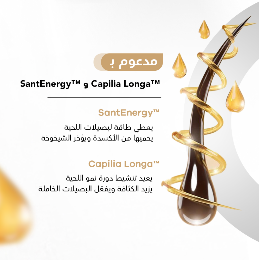 تركيبته المتطورة المدعّمة بمكونات فعالة مثل Capilia Longa™ وRedensyl® وProcapil™ تعمل على تنشيط بصيلات الشعر، وتحفيز نمو الشعيرات الجديدة، وتقوية اللحية من الجذور لتبدو أكثر امتلاءً وجاذبية.