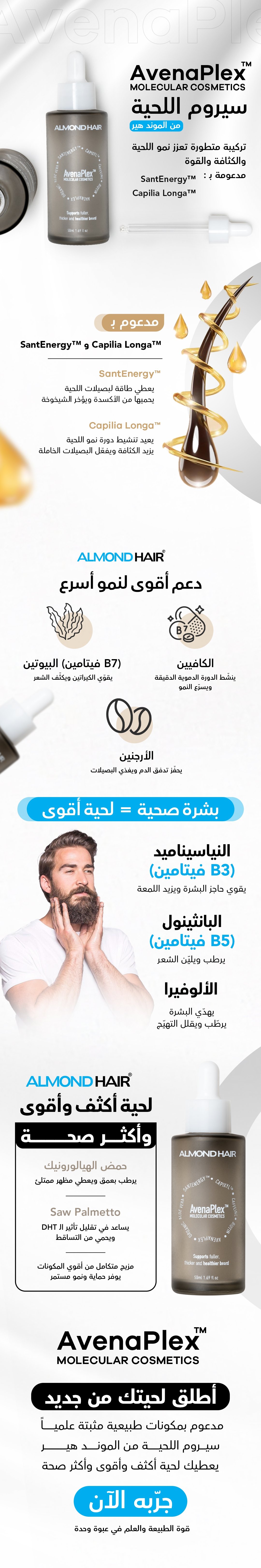 احصل على لحية أكثر كثافة وقوة مع سيروم اللحية الرجالي من AlmondHair، المصمم خصيصًا لتحفيز نمو الشعر وملء الفراغات بطريقة طبيعية وآمنة.